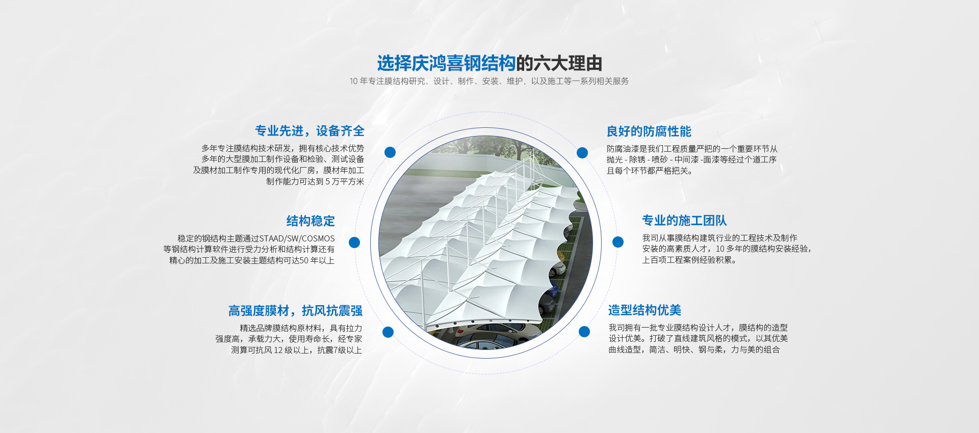 MORE+????????安徽省慶鴻喜鋼結(jié)構(gòu)有限公司是一家專業(yè)從事膜結(jié)構(gòu)工程的綜合性公司。公司秉承“信譽第一、質(zhì)量第一”的宗旨。開拓、發(fā)展、創(chuàng)新的理念。目前公司主營膜結(jié)構(gòu)設(shè)計、膜裁剪設(shè)計、膜材加工及鋼結(jié)構(gòu)安裝與維修。公司擁有一批國內(nèi)較早從事膜結(jié)構(gòu)行業(yè)的高素質(zhì)技術(shù)人員和安裝隊伍,擁有先進的鋼膜設(shè)計軟件3D3S、forten32、和FSCAD,在設(shè)計上大膽創(chuàng)新,在加工上精益求精,在施工上安全認證,在售后上讓客戶使用放心。